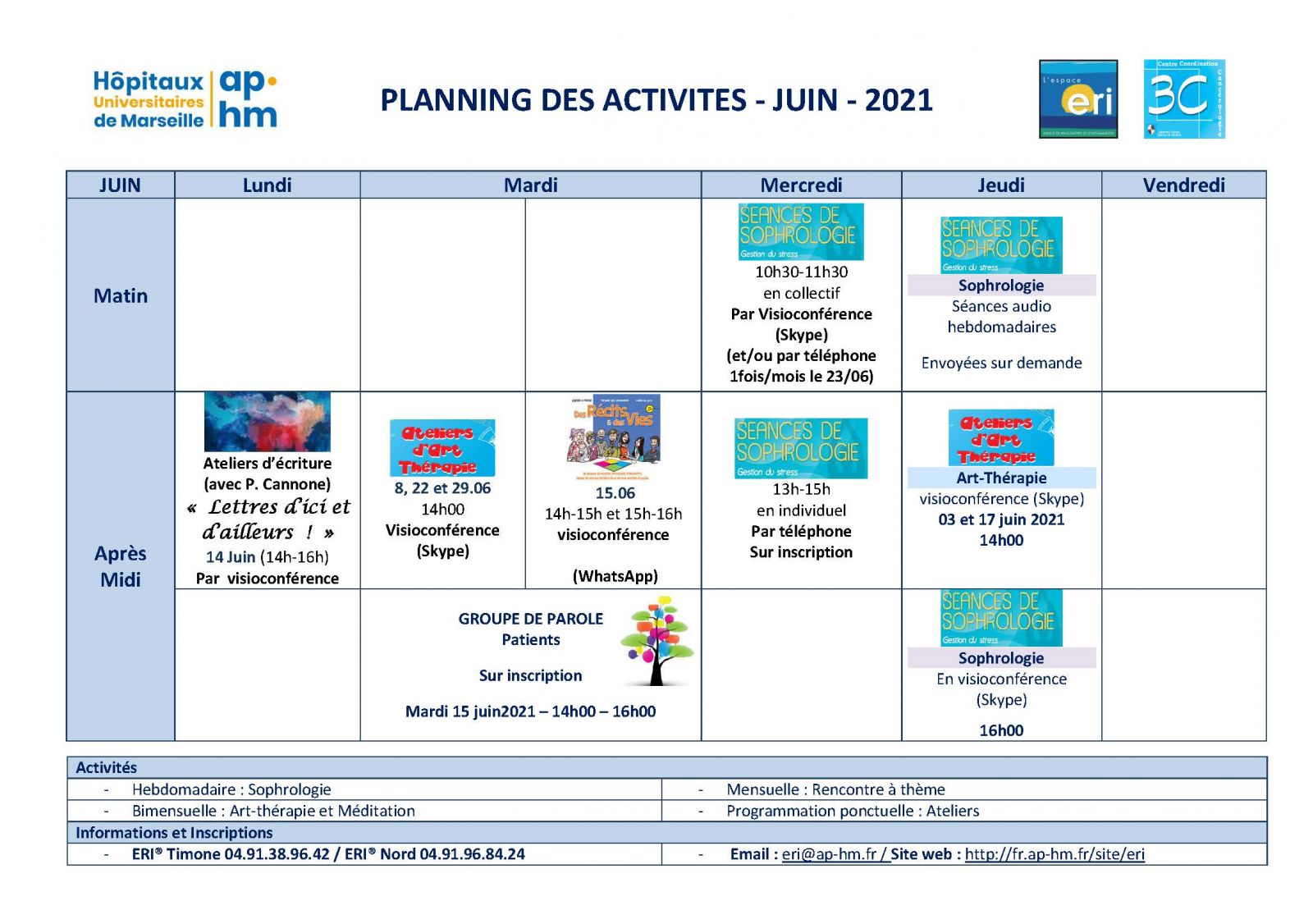 Veuillez trouver ci-joint le planning mensuel des activités des ERI Timone et Nord pour le mois de JUIN 2021.
