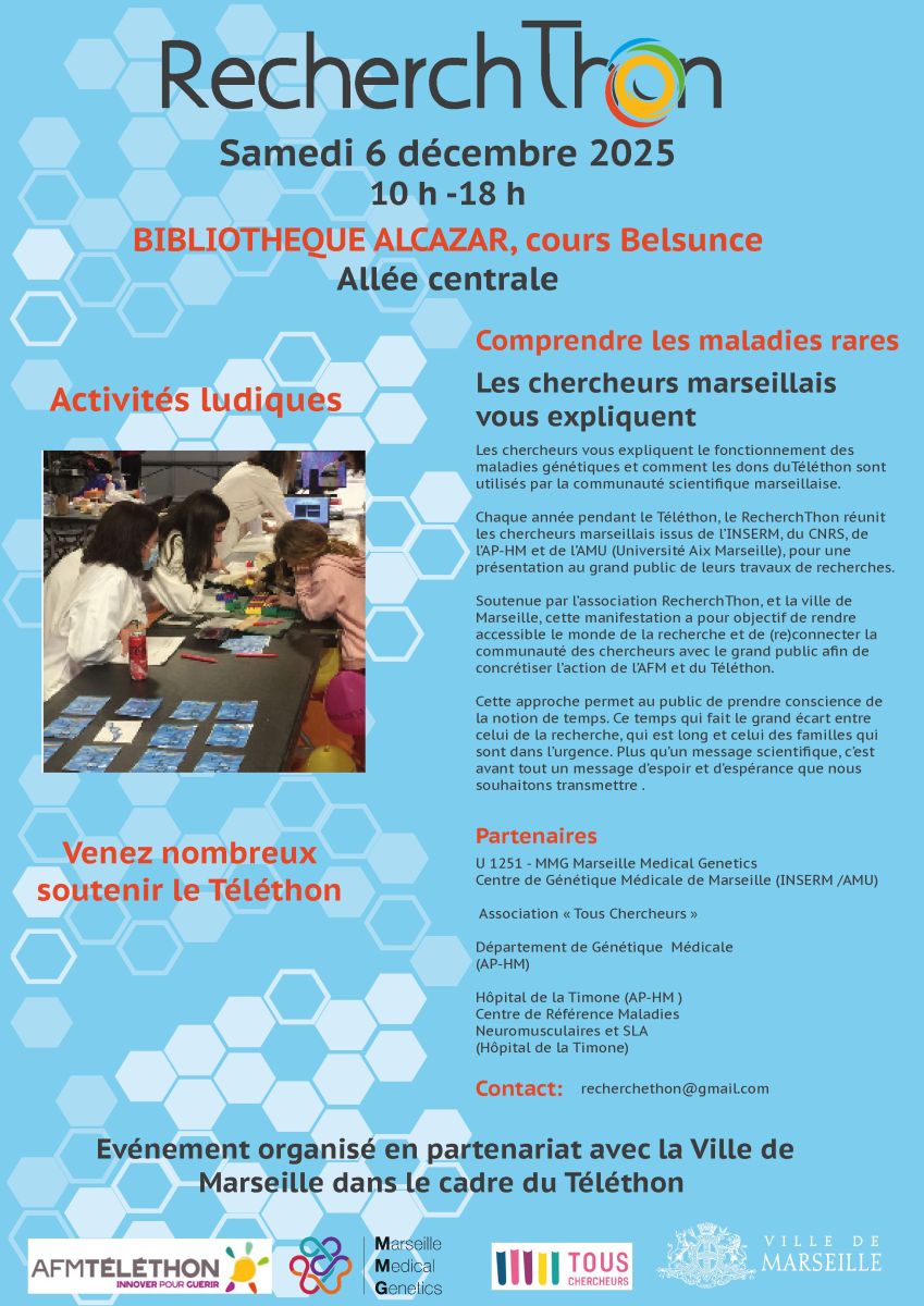 Cet événement réunit chaque année des chercheurs issus de l’INSERM, du CNRS, de l’AP-HM et d’Aix-Marseille Université. Il a pour objectif de rendre la recherche plus accessible au grand public en expliquant le fonctionnement des maladies génétiques et en montrant comment les dons du Téléthon soutiennent les avancées scientifiques menées à Marseille.