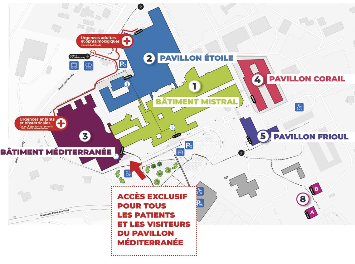 L’accès se fera exclusivement par le bâtiment Méditerranée (la liaison intérieure bâtiment central Mistral et bâtiment Méditerranée sera temporairement condamnée) - Patients du service de médecine nucléaire, l’accès se fera par le bâtiment Mistral ou le pavillon Etoile mais le cheminement évolue : l'accès au service de médecine nucléaire se fera par une passerelle dédiée située en face de la cafétéria : laissez-vous guider par la signalétique !